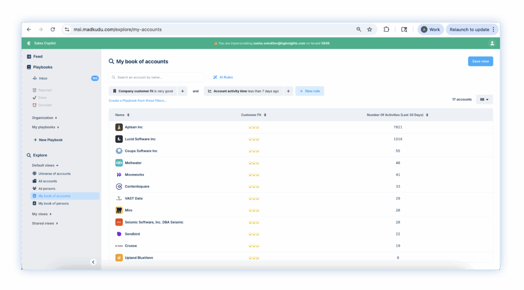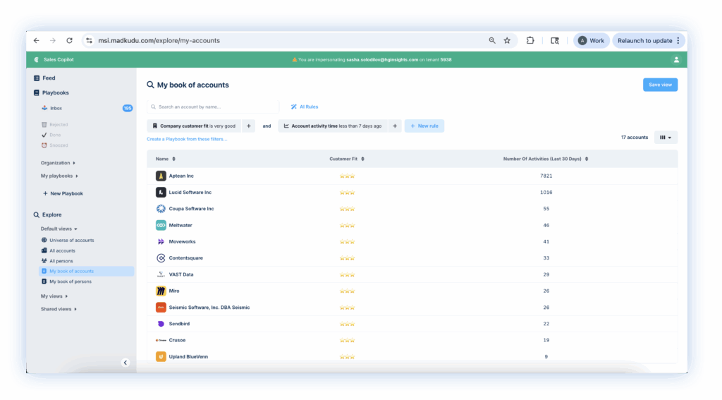 Equip SDRs, AEs, and CSMs with prioritized accounts, key contacts, and role-based insights so every touch is tailored to the right buyer, message, and moment in the journey.