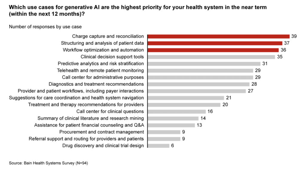 According to the Bain survey, some of the key use cases for AI in healthcare are reducing administrative burdens and enhancing efficiency. Other use cases include clinical decision support, remote patient monitoring, improving patient outcomes with treatment recommendations, and even new drug discovery.