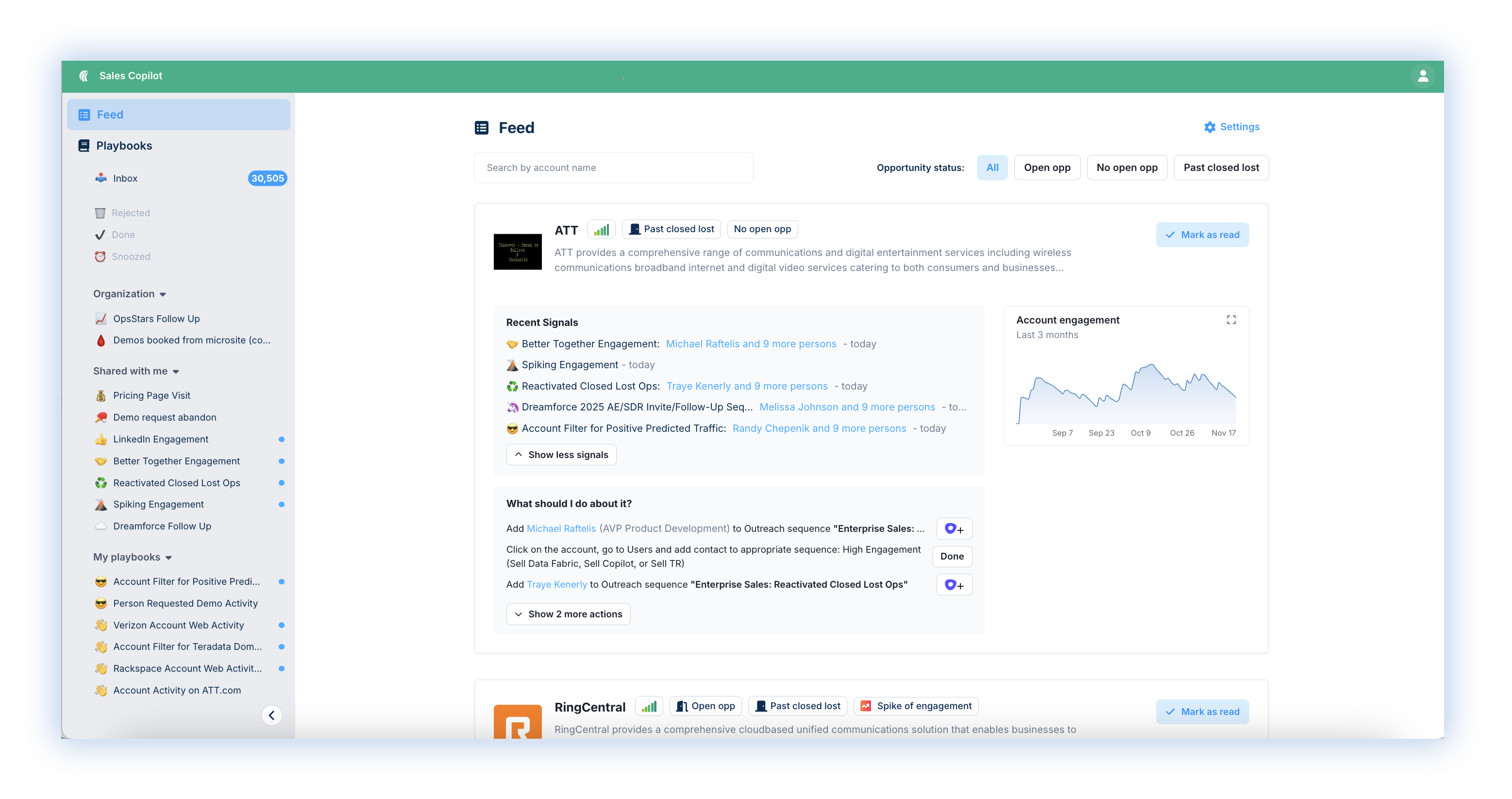 As part of our Platform, Sales Copilot transforms buyer signals into actionable playbooks, helping sales efficiently engage and reduce sales cycles with AI daily guidance, account research, and outreach personalization.