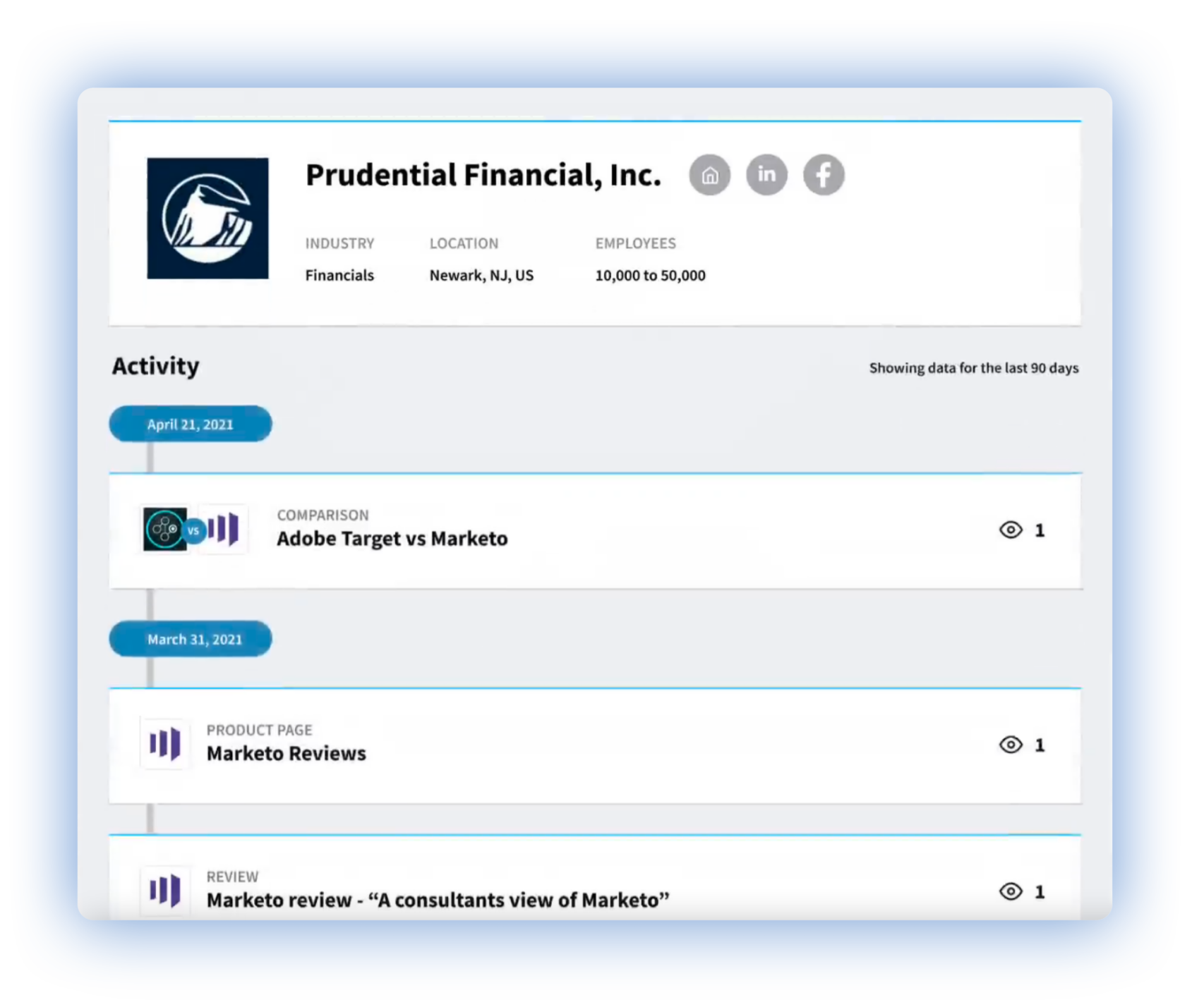 - Use in-depth purchase intent data like pricing views and competitor comparisons to identify sales-ready buyers and trigger the right workflows.