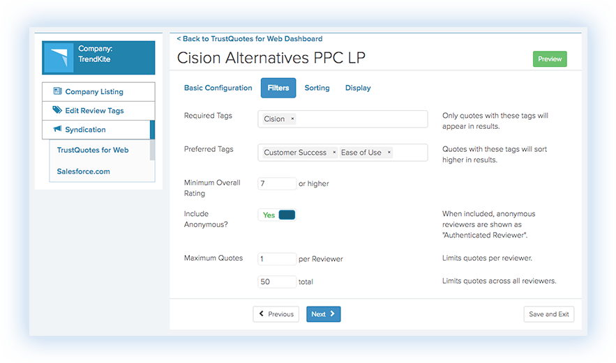 - Quickly syndicate tagged customer quotes to web and landing pages while matching your brand’s look and feel.