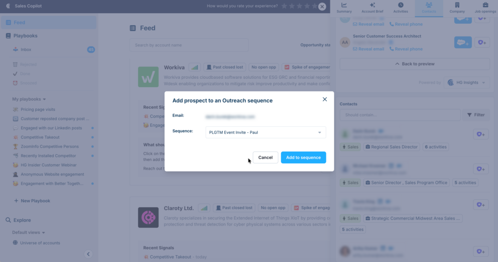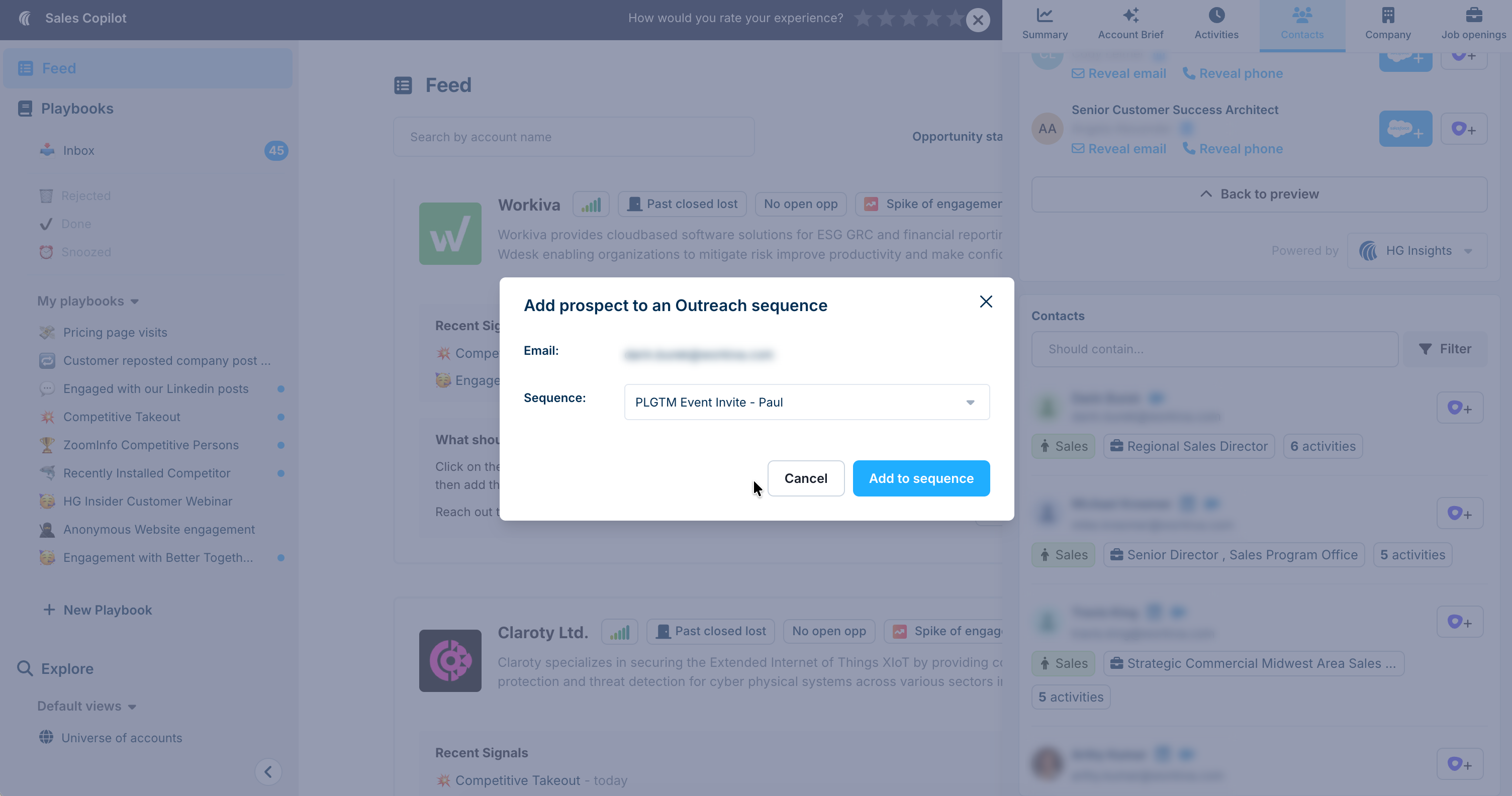 Contacts enriched through HG Insights can be activated directly into Salesforce, Gong, Outreach, Salesloft, and HubSpot without leaving the Sales Copilot workflow. This removes the manual step of exporting or copying contact data between tools. Sellers move from contact discovery to direct CRM or engagement platform activation inside the same platform where they accessed account intelligence, reducing time to first outreach.