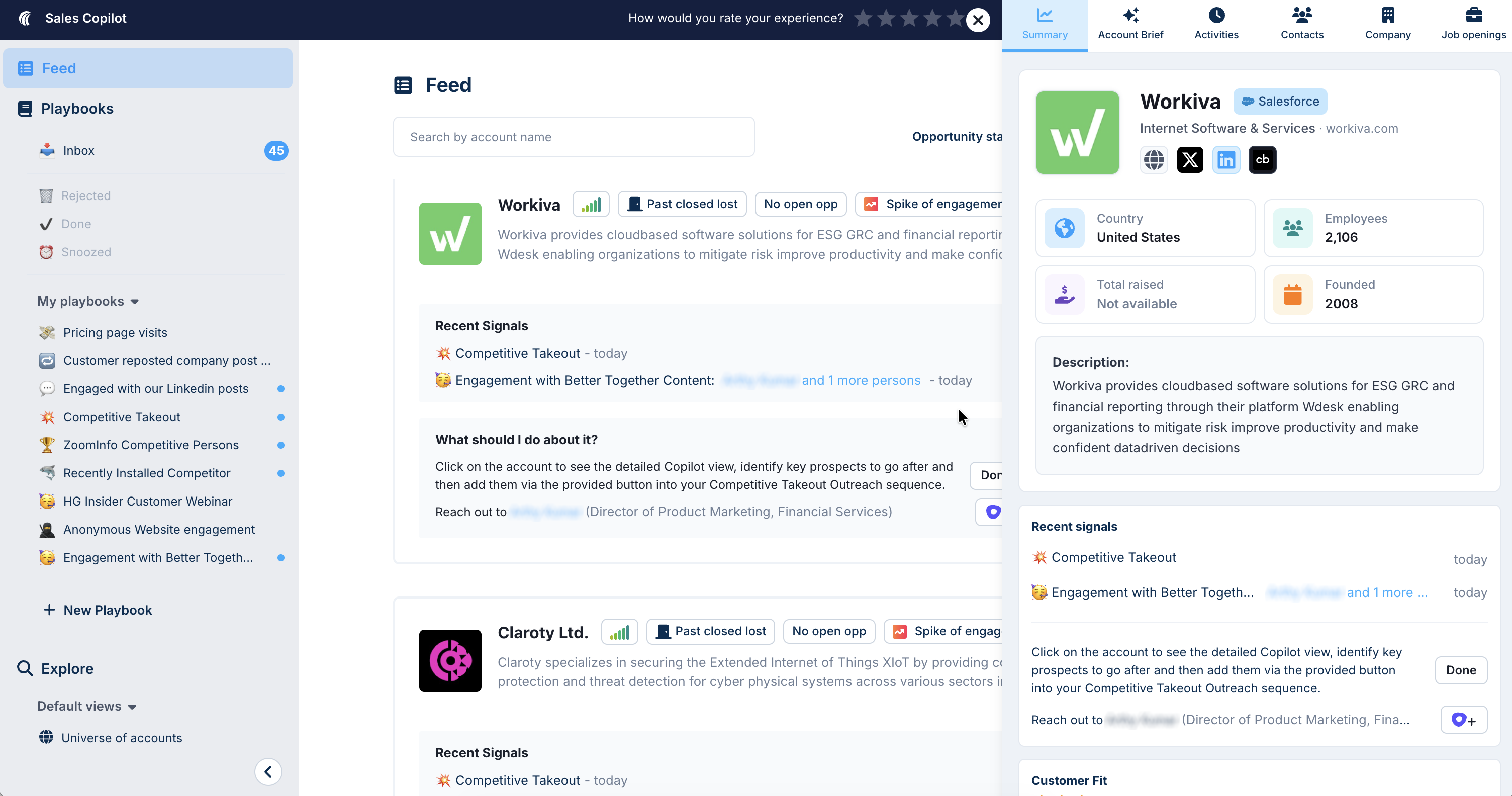 - Embedded in Sales Copilot. Contact recommendations surface inside the same workflow where sellers access account signals.