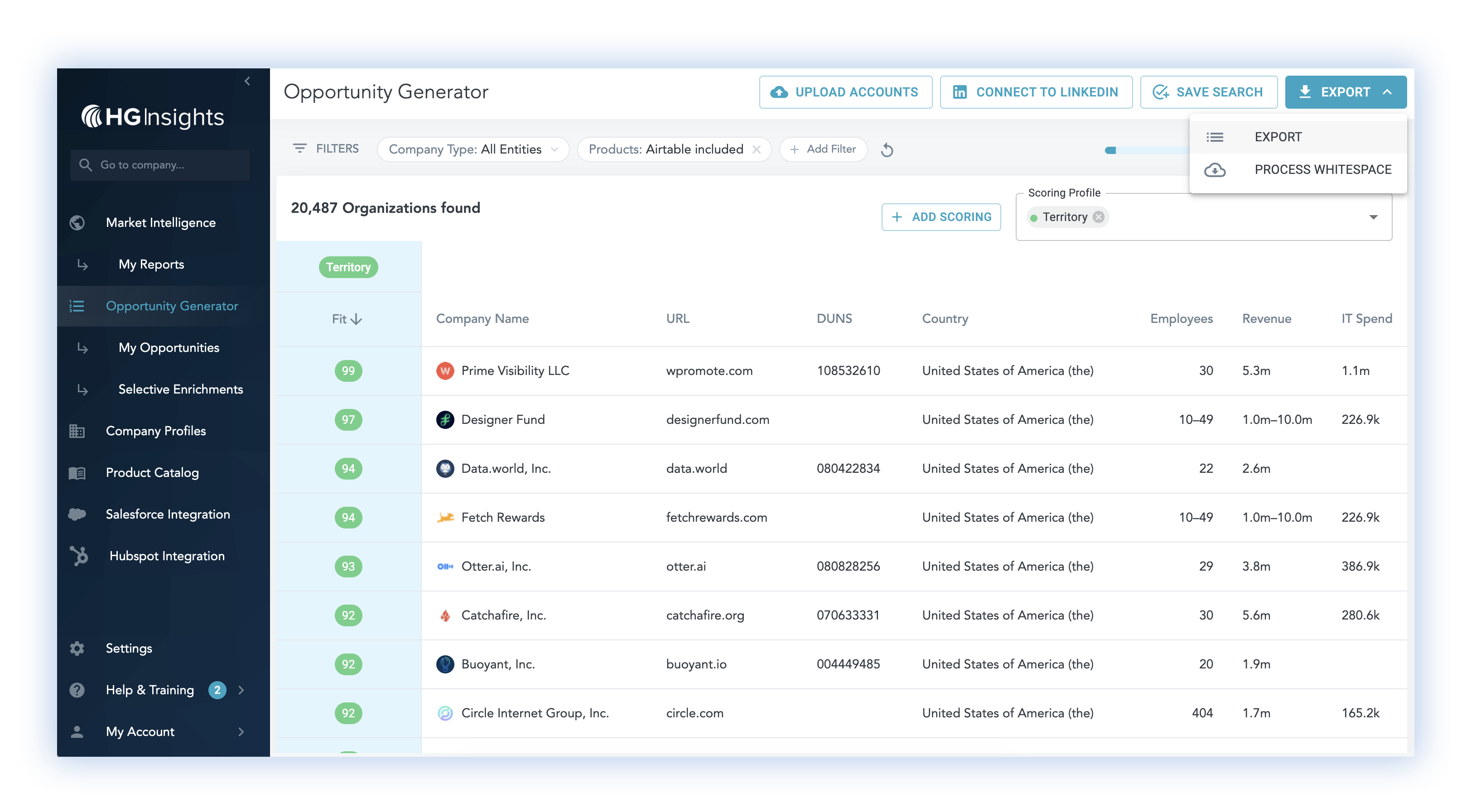 HG Insights enables teams to compare territories side by side using standardized scoring models that account for opportunity size, account quality, and expected revenue potential.