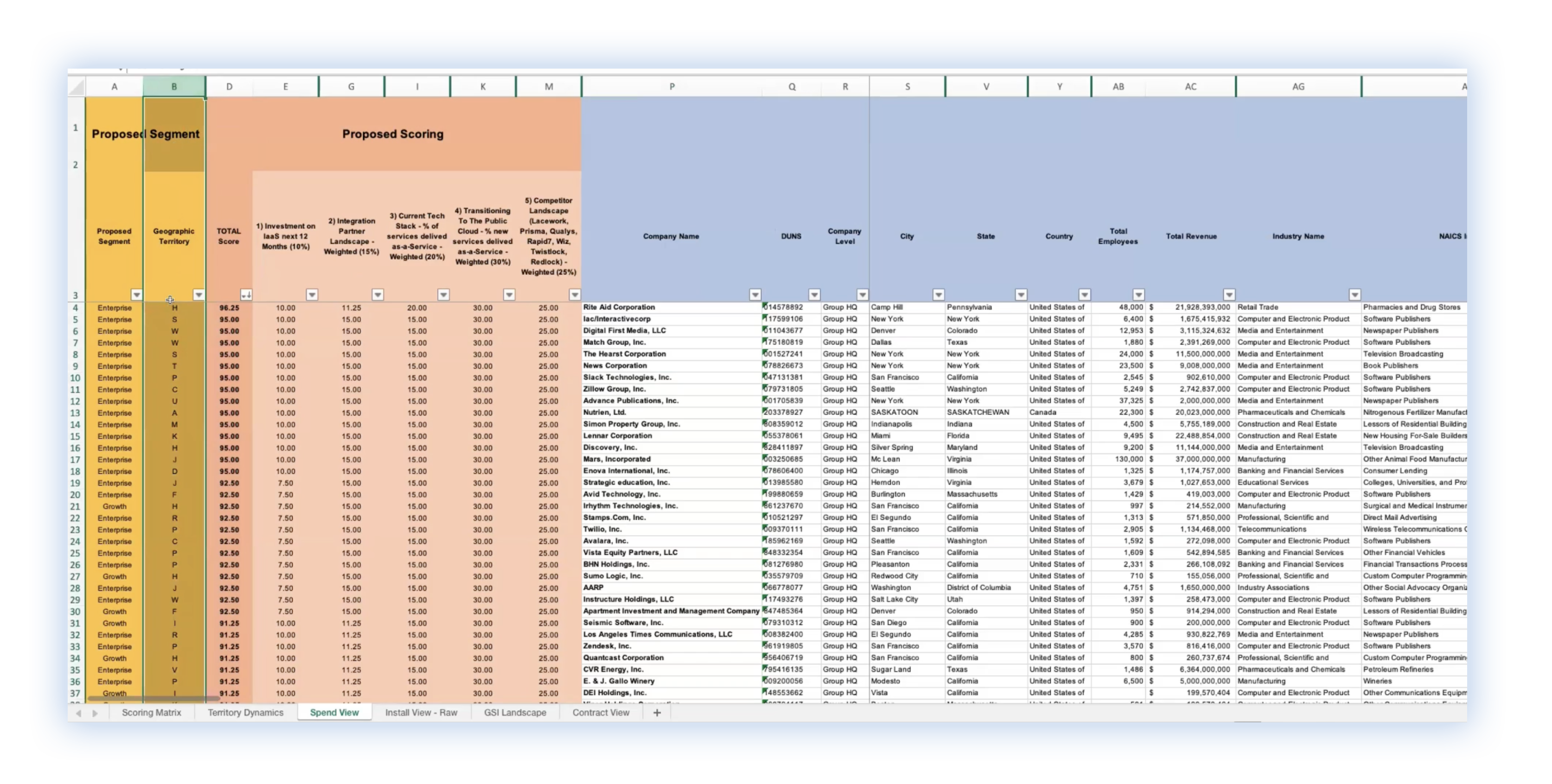 - Apply weighted scoring using account fit and revenue opportunity metrics.