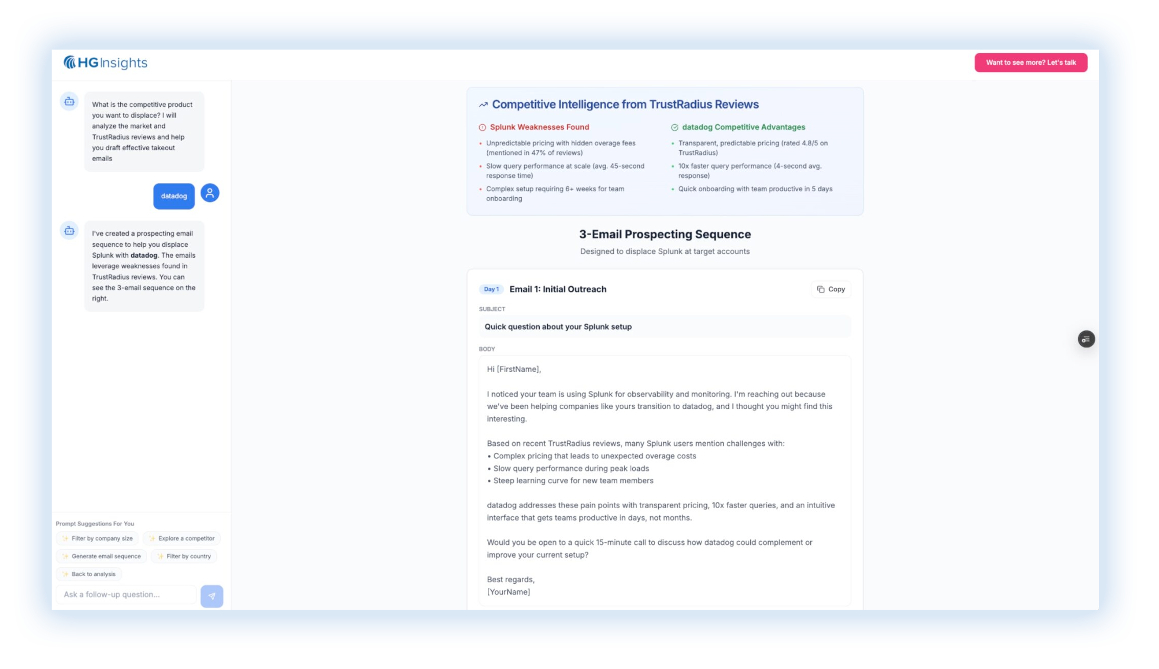 Our market analysis agent functionality with a conversation copilot enables GTM leaders to interactively build, explore, and act on their total addressable market, ideal customer profile, competition, and whitespace with speed and confidence.