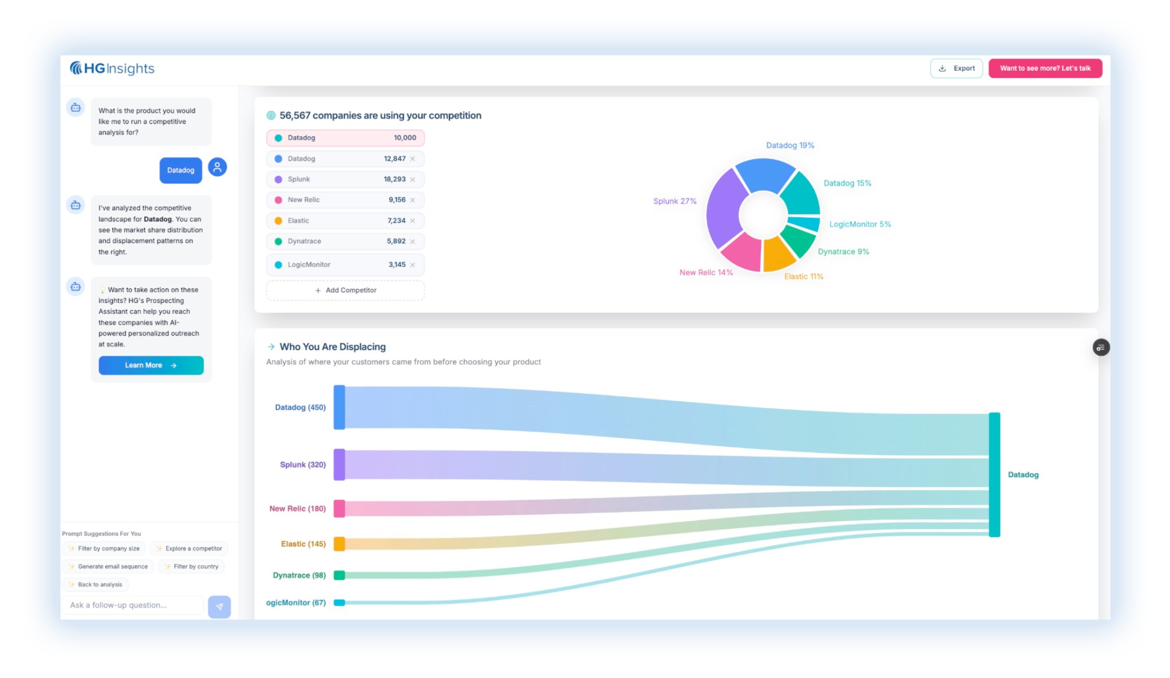 Perform accurate, AI-driven competitor market analysis to uncover size, geo, and segment shifts, spending, and key technologies to surface opportunities — down to targeting rival accounts for competitive displacement.